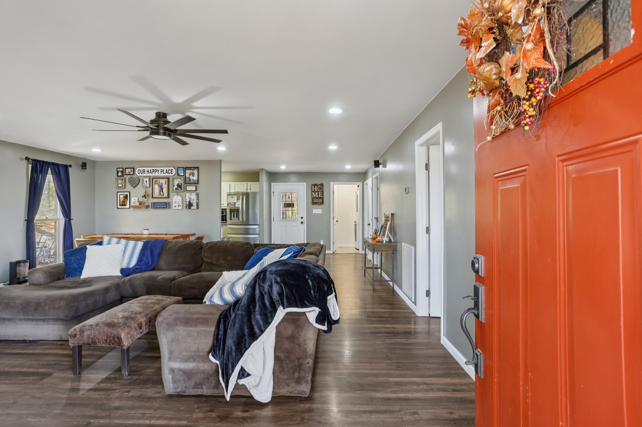 Inside, a large central living space anchors the home and creates a comfortable, inviting flow. Two cozy bedrooms and the full bath are located on one side, with the kitchen and dining/living area on the other, giving the home a practical split layout that feels larger than it looks. The kitchen and bath feature updated cabinetry, adding both style and storage.
